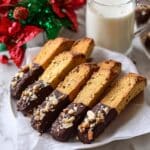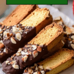 - Dip and Decorate: Dip half of each cooled biscotti into the melted chocolate, then place on a parchment-lined plate. Sprinkle chopped roasted almonds on the chocolate-coated side.