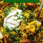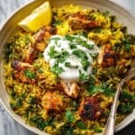 - Serve with optional yogurt: Scoop the turmeric chicken and rice into bowls and top with a dollop of Greek yogurt if desired to add creaminess and balance flavors.
