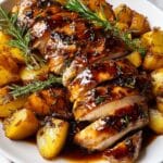 The image shows a white plate filled with several pieces of sliced roasted chicken layered neatly in the center, each piece showing a shiny, dark golden-brown glaze with herbs scattered on top. Surrounding the chicken slices are chunky, roasted yellow potatoes coated in the same glaze, with some wedges peeking from beneath the chicken. Sprigs of fresh green rosemary are placed on top and around the chicken, adding a pop of color. The surface under the plate features a white marbled texture, with a soft cloth partially visible on the side. The dish looks juicy and rich, with the sauce pooling slightly at the bottom. photo taken with an iphone --ar 4:5 --v 7