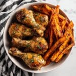 PrintBaked Chicken Drumsticks with Sweet Potato Fries Recipe