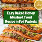 This baked trout recipe features delicate trout fillets marinated in a flavorful honey mustard sauce. The trout is seasoned, sealed in foil packets, and baked to tender perfection, creating a healthy, aromatic dish ideal for a quick and tasty meal. Garnished with sesame seeds, fresh parsley, and lemon slices, it offers a delightful balance of sweetness, tang, and savory umami.