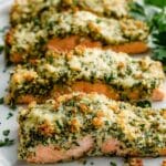- Serve and Garnish: Remove the salmon from the oven, carefully open the foil, and garnish with additional chopped parsley and parmesan cheese if desired. Serve immediately while hot.