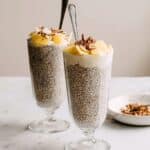 Two tall clear glasses filled with creamy chia pudding, showing a thick layer of tiny, dark chia seeds mixed evenly throughout a beige base. On top of each pudding layer, there is a topping of light yellow slices and shreds, adding texture and color contrast, along with fine brown shavings scattered over the top. Each glass has a long silver spoon standing upright inside. The glassware rests on a white marbled surface with a small white bowl and a plate of brown bits blurred gently in the background. photo taken with an iphone --ar 4:5 --v 7
