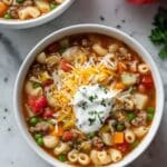 This hearty Beef and Macaroni Soup combines lean ground beef, vegetables, and pasta in a flavorful beef broth, seasoned with Italian herbs and Worcestershire sauce. Perfect for a comforting weeknight meal, this soup is garnished with sour cream, shredded cheddar cheese, and fresh parsley for an added creamy and savory touch.