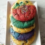 Celebrate Pride with these colorful and festive Big Gay Pride Cookies. This recipe features vibrant, multi-colored cookie dough swirled together and studded with chocolate candies and sprinkles. These soft-baked cookies boast a buttery, sweet flavor and a playful appearance perfect for any joyful occasion or to show your support in a delicious way.