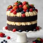 This Black Velvet Cake is a rich, deeply chocolatey dessert with an intense black cocoa flavor paired with a smooth and creamy vanilla Swiss meringue buttercream. Perfect for special occasions or a luxurious treat, this recipe yields three 8-inch layers with a moist, tender crumb and a balanced sweetness that highlights the unique black cocoa powder.