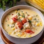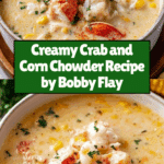 Bobby Flay’s Crab & Corn Chowder is a rich and creamy seafood soup that combines succulent lump crab meat with sweet corn and aromatic spices. This comforting chowder features a velvety blend of heavy cream and seafood stock, infused with smoked paprika, cayenne, thyme, and rosemary, offering a deliciously layered coastal flavor perfect for any seafood lover.