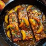 This Bourbon Peach Roasted Salmon combines sweet, tangy, and savory flavors for a deliciously balanced meal. Juicy peaches and a bourbon-infused marinade elevate tender salmon to a delightful dinner centerpiece. Perfect for a special weeknight or entertaining guests.