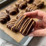 A close-up view of a square chocolate-covered treat held by a woman's hand, with a smooth dark brown chocolate coating topped by thick diagonal stripes of light brown peanut butter drizzle. Behind it is a grey baking tray lined with a silicone mat holding several identical square treats in neat rows. The background is a white marbled texture under soft natural lighting. photo taken with an iphone --ar 4:5 --v 7