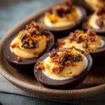 Indulge in delicious Cheesecake-filled Easter eggs, a delightful no-bake dessert featuring a crunchy digestive biscuit base inside hollow chocolate eggs, filled with a smooth mascarpone and cocoa cheesecake mixture, topped with festive mini chocolate eggs and drizzled with caramel or melted chocolate for a perfect Easter treat.