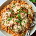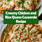 This Chicken and Rice Queso Casserole is a comforting and creamy baked dish combining tender seasoned chicken, cheesy queso, green chiles, and fluffy rice for a delicious and easy meal that’s perfect for weeknight dinners.