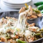 7. Combine Chicken and Vegetables with Cheese: Return the cooked chicken to the skillet with the onions and peppers. Stir everything together and reduce heat to low. Layer the sliced provolone cheese over the mixture, cover the pan with a lid or foil, and let the cheese melt for 1-3 minutes.
