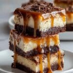 Decadent chocolate caramel cheesecake bars featuring a buttery graham cracker crust, creamy full-fat cheesecake layer, rich semi-sweet chocolate topping swirled with homemade salted caramel, baked to perfection for smooth texture and dramatic marbling. Perfect for indulgent dessert occasions with options for customization and dietary adaptations.