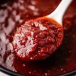A close-up of a thick, rich dark red sauce with a glossy, slightly chunky texture in a white spoon resting in the same sauce, showing some small bits and a deep, almost brownish-red color throughout. The sauce has a shiny surface with areas catching light and looks dense with a bit of oil on top, all in a smooth container with a black edge visible at the bottom. The background is a white marbled texture. Photo taken with an iphone --ar 4:5 --v 7