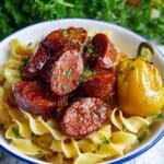 - Finish and Serve: Stir the kielbasa mixture thoroughly before serving. Enjoy it over egg noodles, mashed potatoes, or your preferred side dish for a delicious meal.