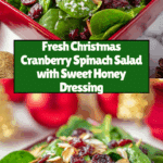 Keywords: Christmas salad, cranberry spinach salad, holiday salad, fresh spinach salad, toasted almond salad, vinaigrette dressing, festive salad, healthy holiday recipe