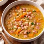 • Using a ham bone adds extra depth and smokiness to the broth.