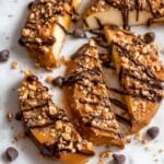 The image shows several thick apple slices arranged in a loose ring on a white marbled surface, each slice topped with a smooth, shiny layer of caramel that is light brown in color. Over the caramel, a dark brown chocolate drizzle is spread unevenly, creating a contrast in texture and color. The top of each slice is sprinkled with small crushed nuts, adding a crumbly texture and golden tan highlights. Scattered chocolate chips are also visible around the apple slices, giving a hint of the ingredients. The overall look is rich and inviting with a mix of soft, smooth, and crunchy textures. photo taken with an iphone --ar 4:5 --v 7