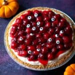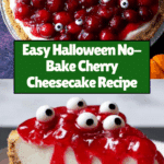 This festive Halloween No-Bake Cherry Cheesecake is a delightful and easy-to-make dessert perfect for the spooky season. Featuring a creamy, smooth cream cheese filling blended with whipped cream on a graham cracker crust, topped with a vibrant cherry pie filling and fun candy eyes for a playful touch. No baking required, making it an accessible treat for all skill levels.