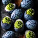 Halloween Swamp Eggs are a spooky twist on classic deviled eggs, featuring a crackled blueberry-dyed shell and a vibrant green filling. Perfect for a festive party, they bring a fun and eerie touch to your appetizer table.