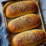 Three long bread loaves lie side by side on a baking tray covered with parchment paper, each loaf having a smooth, golden brown surface topped thickly with a mix of coarse yellow and dark brown crumbs or seeds that add a rough texture on top. The bread crust looks soft and shiny with a slightly toasted finish, and the tray sits on a white marbled textured surface with a blue and white cloth visible on the left side. Photo taken with an iphone --ar 4:5 --v 7