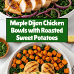 Delicious and wholesome Maple Dijon Chicken & Roasted Sweet Potato Bowls featuring tender chicken breasts marinated in a tangy and sweet maple Dijon sauce, paired with perfectly roasted smoky sweet potatoes, nutritious quinoa or brown rice, fresh greens, and crunchy toasted nuts. This easy-to-make, flavorful bowl is ideal for a balanced, satisfying meal packed with sweet, savory, and nutty flavors.