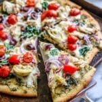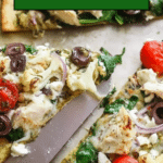 This Mediterranean Chicken Flatbread features crispy naan bread topped with flavorful pesto, melted mozzarella, tender shredded chicken, fresh veggies, kalamata olives, and tangy feta cheese. It’s a quick and delicious meal perfect for lunch or dinner, combining Mediterranean flavors with the convenience of flatbread pizza.