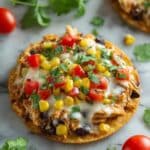 Crispy baked corn tortillas topped with a flavorful mixture of shredded rotisserie chicken, black beans, corn, salsa, and taco seasoning, finished with melted Colby Jack cheese and fresh, vibrant garnishes of cilantro and diced tomatoes. This Mexican-inspired tostada recipe is easy to prepare, perfect for a quick lunch or dinner that delivers a satisfying combination of textures and bold flavors.
