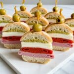 A delicious New Orleans inspired Muffaletta Sandwich Bites recipe featuring a tangy olive spread layered with an assortment of Italian deli meats and cheeses, all served on crusty ciabatta rolls. Perfect as a flavorful appetizer or party snack, these sandwich bites combine bold flavors with a satisfying texture.