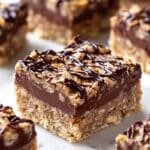 7. Add Top Layer and Drizzle: Pour the remaining oat mixture over the chocolate layer, pressing gently to form the top layer. Drizzle the reserved chocolate mixture on top for decorative finish.