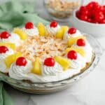 - Decorate and serve: Before serving, garnish the pie with swirls of cool whip, a sprinkle of toasted coconut flakes, pineapple slices, and maraschino cherries for an extra festive look and added flavor.