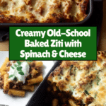 This classic old-school baked ziti recipe combines perfectly al dente pasta with a rich meat and tomato sauce, fresh spinach, and a blend of mozzarella and pecorino cheeses. Baked until bubbly and golden, it’s an irresistible Italian-American comfort food perfect for family dinners.