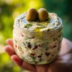 - Assemble the dip: Spoon the dip into a jar or serving bowl. Drizzle with olive oil and garnish with whole green olives on top for presentation and an extra olive flavor punch.