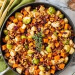 Keywords: one pot chicken skillet, harvest chicken skillet, fall chicken recipe, autumn skillet meal, chicken with sweet potatoes and Brussels sprouts