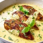 A white shallow bowl filled with three browned, crispy chicken breasts arranged side by side, each covered partially with a thick, creamy light yellow sauce with small flecks of herbs. Fresh green basil leaves are scattered on the sauce and around the chicken, adding bright color. The creamy sauce has a smooth texture with some herbs mixed throughout, gently pooling around and over the chicken. The bowl sits on a white marbled surface. photo taken with an iphone --ar 4:5 --v 7