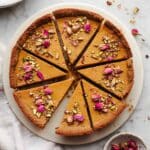 This Persian Love Cake is a beautifully fragrant and moist almond flour cake infused with cinnamon, vanilla, and orange blossom water. Topped with roasted pistachios and delicate dried rose petals, it’s an elegant dessert perfect for special occasions or intimate gatherings. Its tender crumb and Middle Eastern flavors make it a unique and irresistible treat.