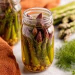 Crisp and tangy pickled asparagus spears preserved in a flavorful brine of white vinegar, water, salt, sugar, pickling spices, and fresh dill. This easy no-cook preservation method allows you to enjoy the bright, herby taste of pickled asparagus after just a day or two, making it a delicious and versatile snack or condiment.