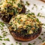 Delicious and hearty Portobello Stuffed Mushrooms filled with a savory mixture of sautéed onions, garlic, spinach, breadcrumbs, and a blend of Gruyère and Parmesan cheeses, baked to golden perfection and topped with fresh herbs.