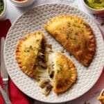 The image shows a white plate with a honeycomb pattern holding two golden brown, fried hand pies. One whole pie is positioned at the top right of the plate, and a second pie is broken into two pieces in the bottom left of the plate, revealing a melted white cheese and mushroom filling inside. The pies have a crispy, slightly textured outer layer sprinkled with green herbs. The plate is on a white marbled surface with a red napkin underneath, holding a silver knife and fork on the left side. There are small white bowls with red salsa on the top left and green guacamole on the right side. Some green herbs are scattered lightly on and around the pies. photo taken with an iphone --ar 4:5 --v 7