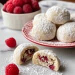 These Raspberry-Filled Almond Snowball Cookies are delicate, buttery treats with a surprise of sweet-tart raspberry jam inside. Coated in powdered sugar, they melt in your mouth and are perfect for any occasion or holiday gathering.