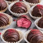 Delightful Raspberry Truffles made with a creamy white chocolate and raspberry powder filling, coated with rich dark chocolate, and finished with a beautiful raspberry powder drizzle. These elegant, no-bake treats blend tart raspberry flavor with luscious chocolate, perfect for gifting or indulging at home.