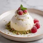 6. Assemble Pavlova Bombs: Place a round of red velvet cake beneath each cooled meringue shell. Generously fill the centers of the shells with the cream cheese whipped filling, allowing it to ooze slightly. Spoon the raspberry coulis over the top, letting it naturally drip down the sides. Garnish each pavlova bomb with fresh raspberries, a light dusting of powdered sugar, and edible flowers for an elegant finishing touch.