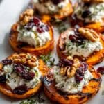 Delight in these Roasted Sweet Potato Rounds topped with creamy herbed ricotta, crunchy walnuts, and sweet dried cranberries. This simple yet elegant appetizer combines the natural sweetness of roasted sweet potatoes with fresh herbs and a variety of textures for a perfect bite-sized treat suitable for any occasion.
