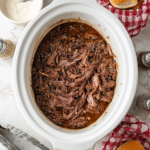 - Shred the beef: When done cooking, remove the roast and shred it using two forks, discarding any excess fat. You may shred the meat directly in the slow cooker or on a separate plate.