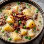 A bowl of creamy soup with three main layers is shown. The bottom layer is a light beige creamy broth with a smooth texture. Floating in the broth are potato chunks that are pale yellow with black pepper specks, green peas, and small pieces of shredded brown beef. On top are crispy small bacon bits with a golden brown color that add texture. The soup is in a dark bowl set on a white marbled surface with a gray cloth beside it. photo taken with an iphone --ar 4:5 --v 7