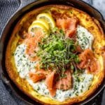 Keywords: Dutch baby, smoked salmon, savory pancake, crème fraîche, brunch recipe, cast iron skillet, lemon dill, Parmesan