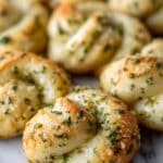 Store garlic knots in an airtight container at room temperature for up to 2 days or refrigerate for up to 5 days. To reheat, warm in a 350°F oven for 5-7 minutes or microwave briefly until heated through. Brush with extra garlic butter after reheating for best flavor and softness.