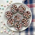 A white plate is filled with round slices of a dessert made from dark chocolate mixed with small, colorful marshmallows in pastel pink, blue, yellow, and white. Each slice shows a thick layer with a rough texture where the marshmallows are embedded in chocolate, and the edges are coated with shredded white coconut. Around the plate, there are scattered whole mini marshmallows on a white marbled surface, and a plaid cloth with red, blue, yellow, and white stripes is placed next to the plate. Photo taken with an iphone --ar 4:5 --v 7