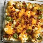 Keywords: Cauliflower casserole, jalapeno popper, cheesy cauliflower bake, low carb side dish, bacon cauliflower bake