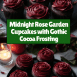 These Wednesday Morticia’s Midnight Rose Garden Cupcakes are moist and rich chocolate cupcakes with a dark, gothic twist. Perfectly fluffy with a hint of cocoa and topped with an elegant, mysterious frosting, decorated with edible glitter and fresh or sugar roses, these cupcakes bring a sophisticated charm to any themed celebration.